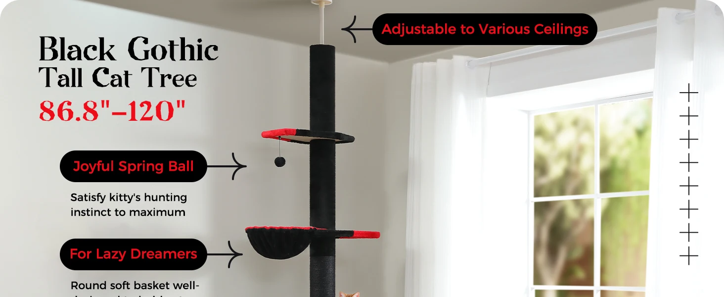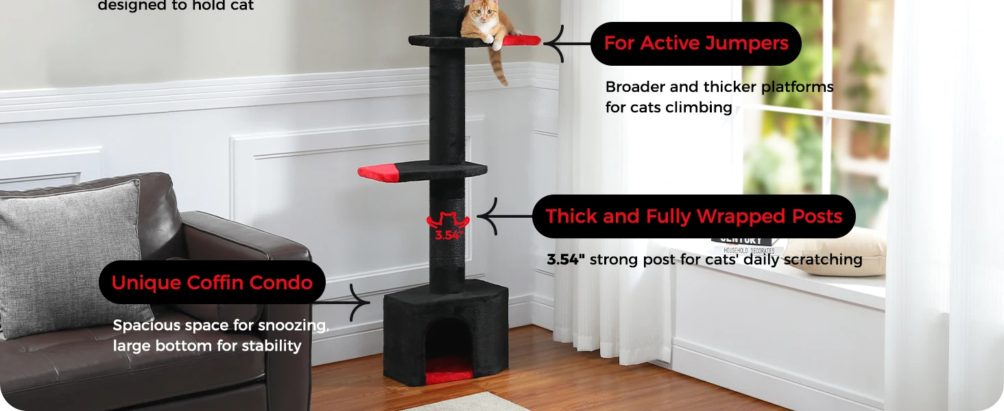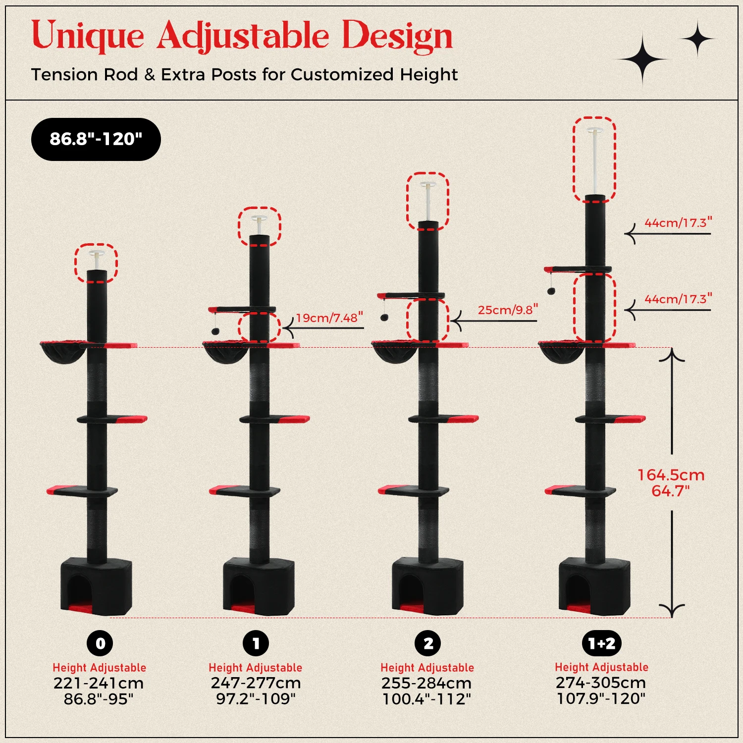 Höhenverstellbar für mehr Platz: Dank des verstellbaren Stangendesigns lässt sich dieser hohe Katzenkletterturm an unterschiedliche Deckenhöhen anpassen, mit einem Verstellbereich von 219 bis 304 cm. Dieser Kratzbaum passt perfekt in die meisten Räume. Darüber hinaus verfügt dieser schwarze Katzenturm über einen stabilen, 8 cm breiten Pfosten, der dicker ist als bei vergleichbaren Produkten auf dem Markt.