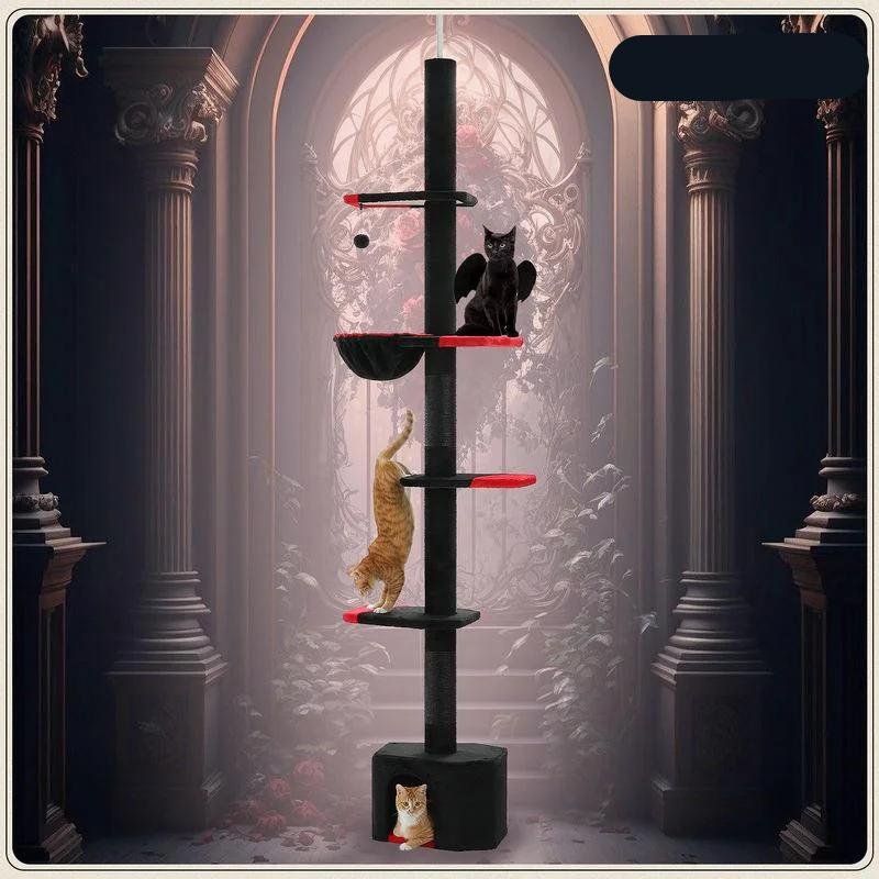 für Gothic-Katzenliebhaber: Dieser auffällige schwarz-rote Gothic-Kratzbaum mit sargförmiger Plattform und Gehege wird Ihre Katzen sicherlich begeistern. Er entführt sie in eine geheimnisvolle Welt dunkler Eleganz und befriedigt alle Bedürfnisse Ihrer Katze nach Kratzen, Springen, Nickerchen und Spielen.