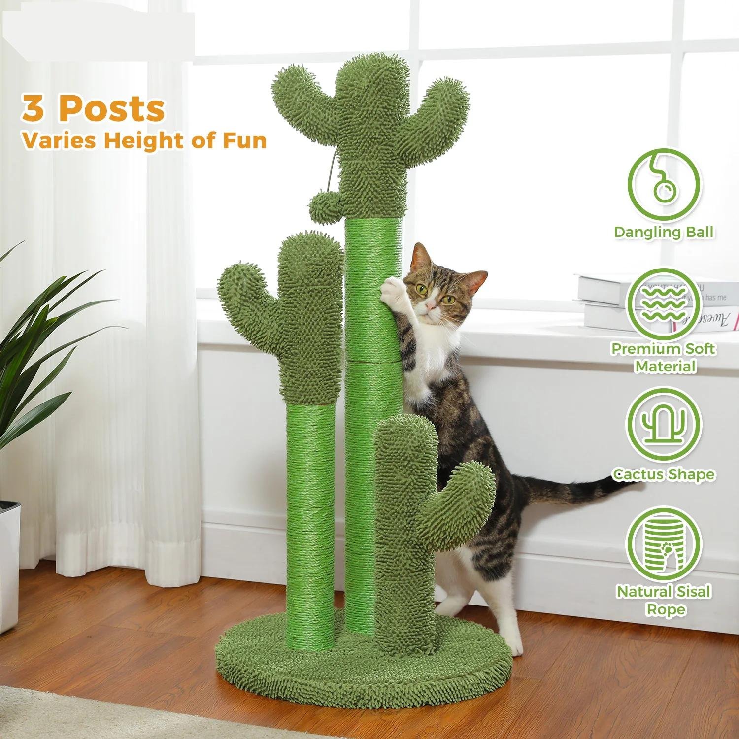 Cactus Cat Scratching Post for Indoor Cats Tall Cat Scratcher with 3 Sisal Scratching Poles Interactive Dangling Ball Cat Toys