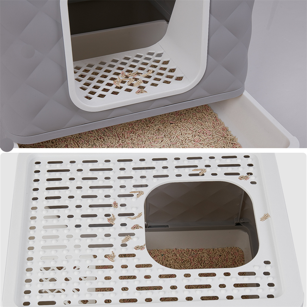 Portable Litter Box: The litter box is portable for home use and detachable when not in use. Easy to set up, ensures a pleasant toilet experience. Made from durable PP + polyester construction, it is eco-friendly, safe, and odorless. Grey color with a unique grid pattern for a beautiful look