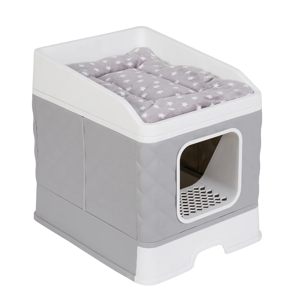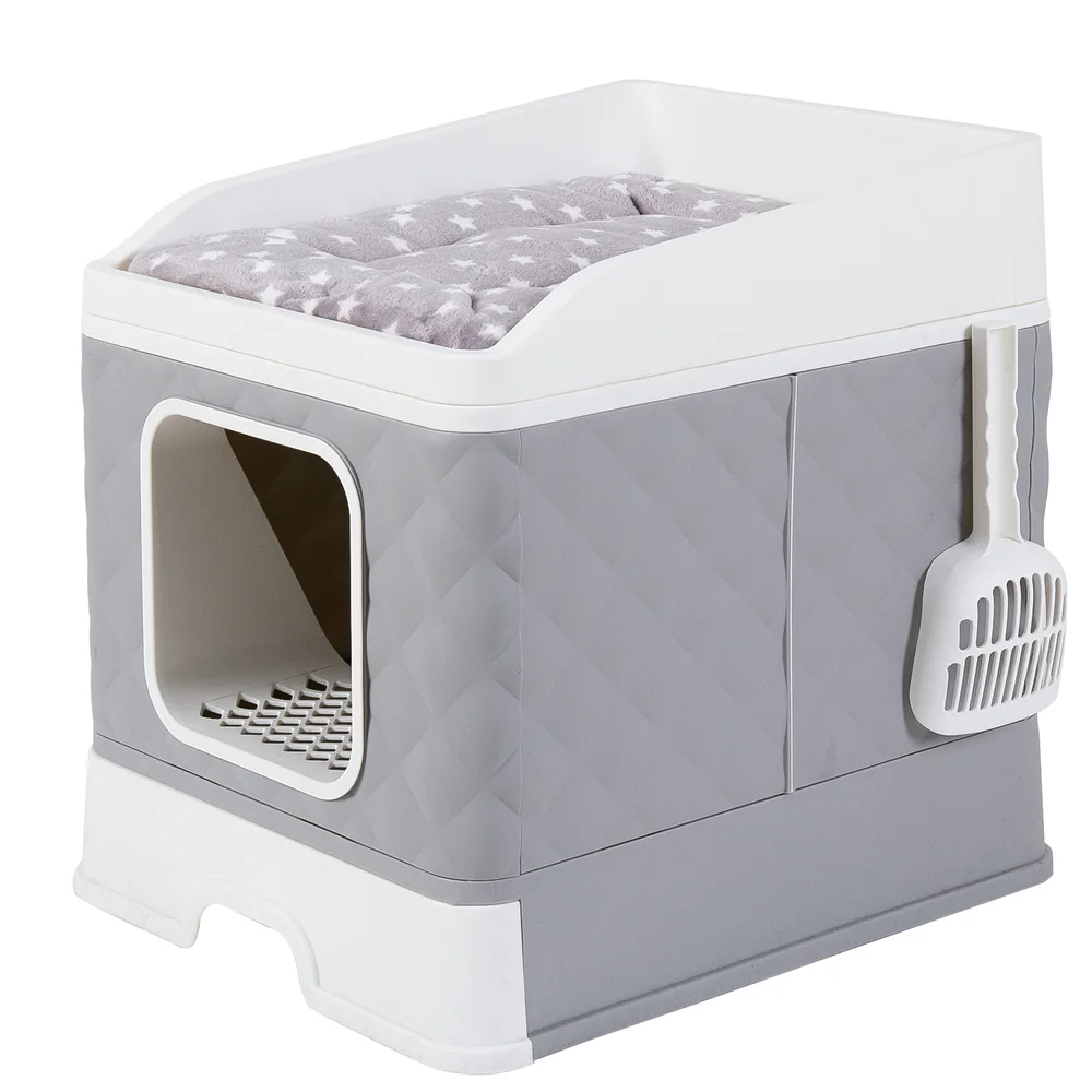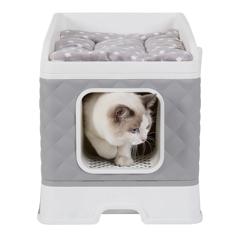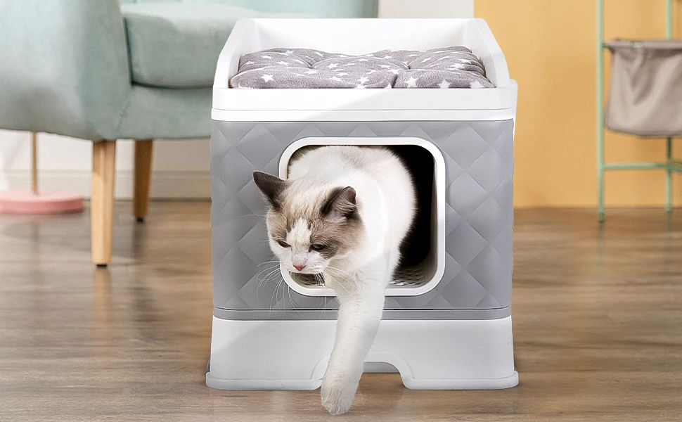 Pet-friendly Litter Box: 2-in-1 use, the enclosed litter box gives your cats a private and safe area to toilet and do their ‘business’ without distraction, and doesn’t make any strange smell everywhere. And it combines with a “cat bed” on top and comes with a cushion pad so the kitten can rest or sleep.