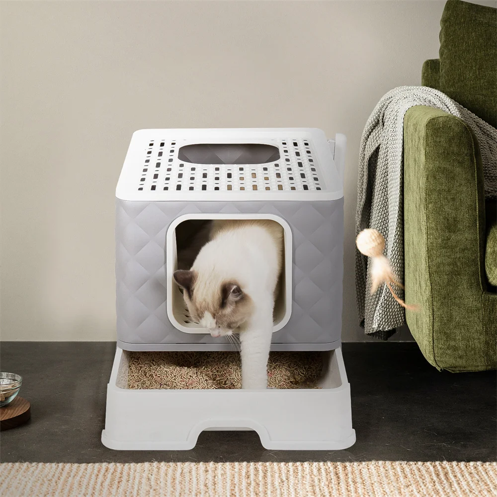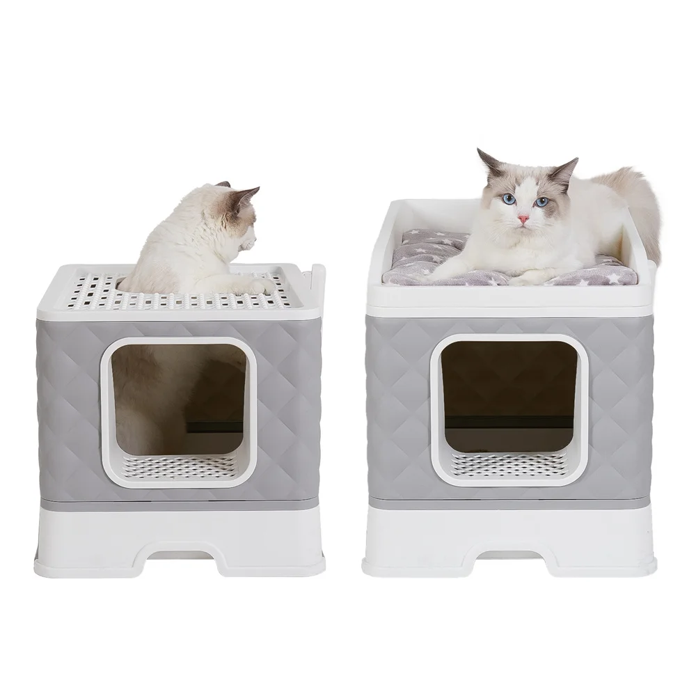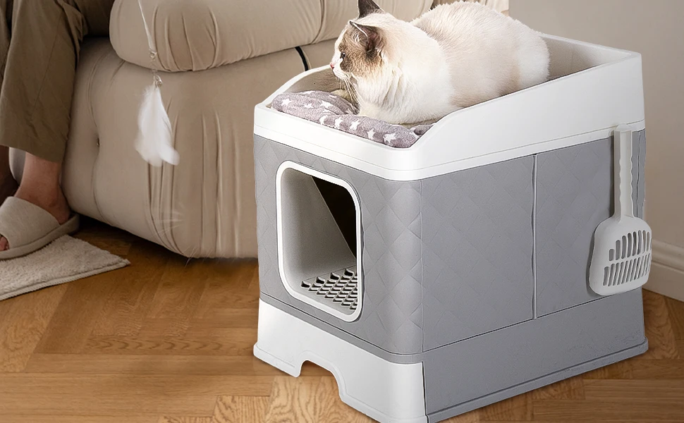 Portable Litter Box: The litter box is portable for home use and detachable when not in use. Easy to set up, ensures a pleasant toilet experience. Made from durable PP + polyester construction, it is eco-friendly, safe, and odorless. Grey color with a unique grid pattern for a beautiful look