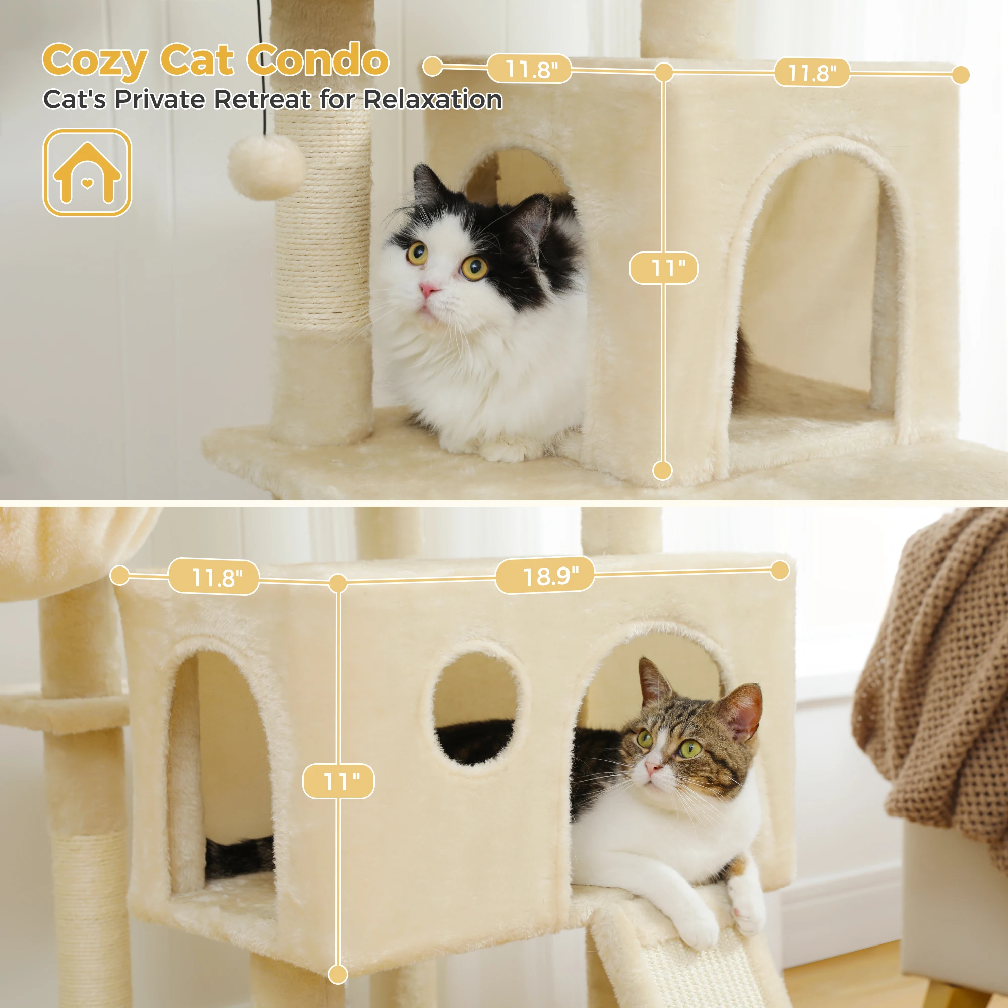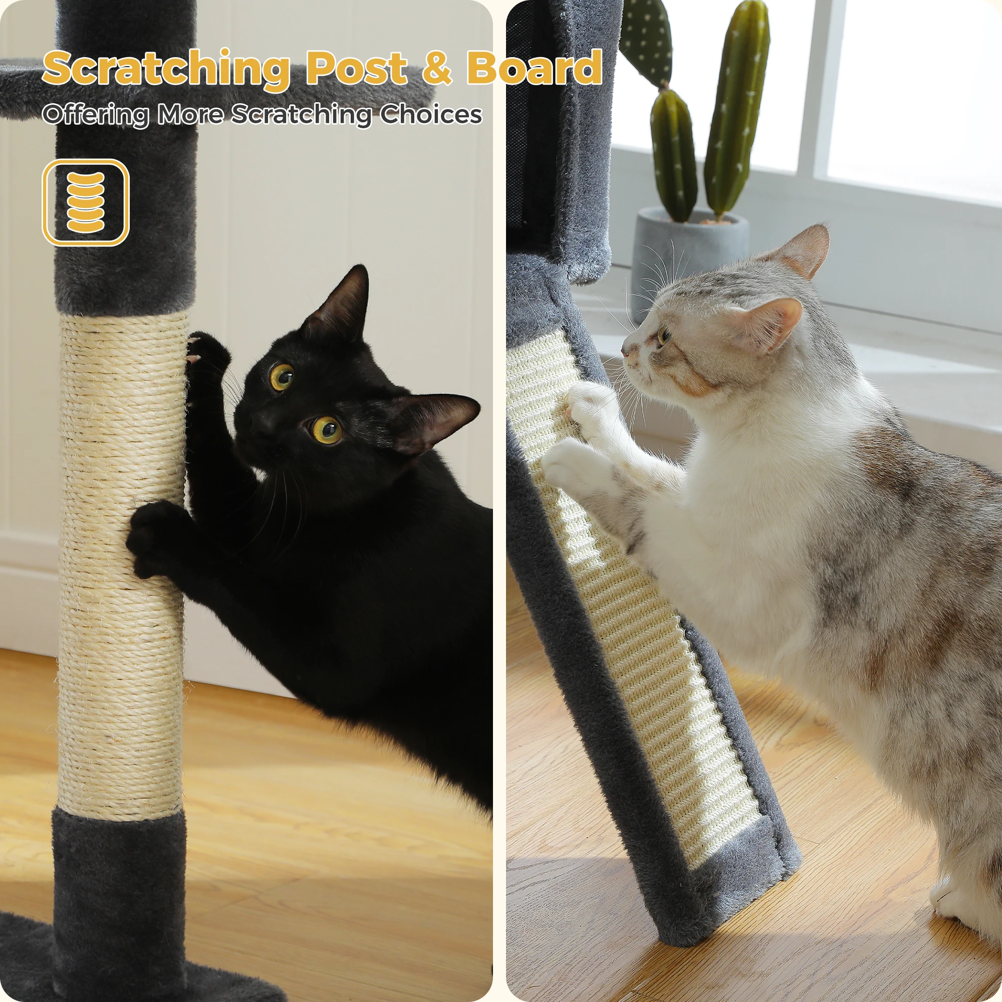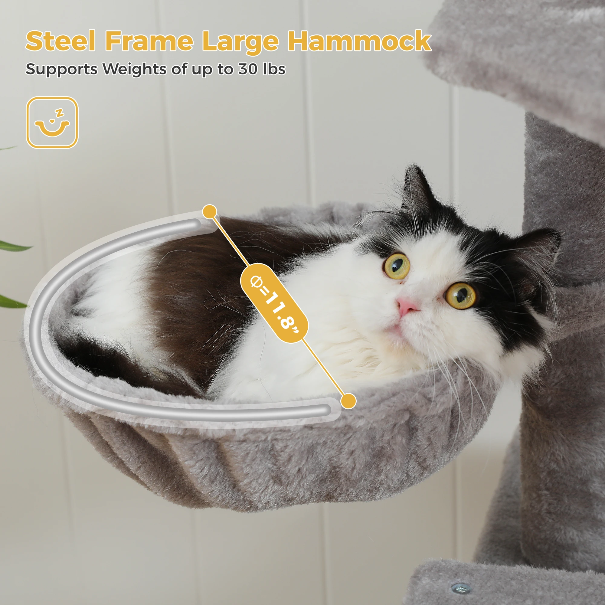 Condo and Perches: The cat tree features a cozy condo at the bottom, offering a private and comfortable space for cats to hide or nap. There are also multiple perches and platforms, some with hammock-like beds, providing various resting spots.