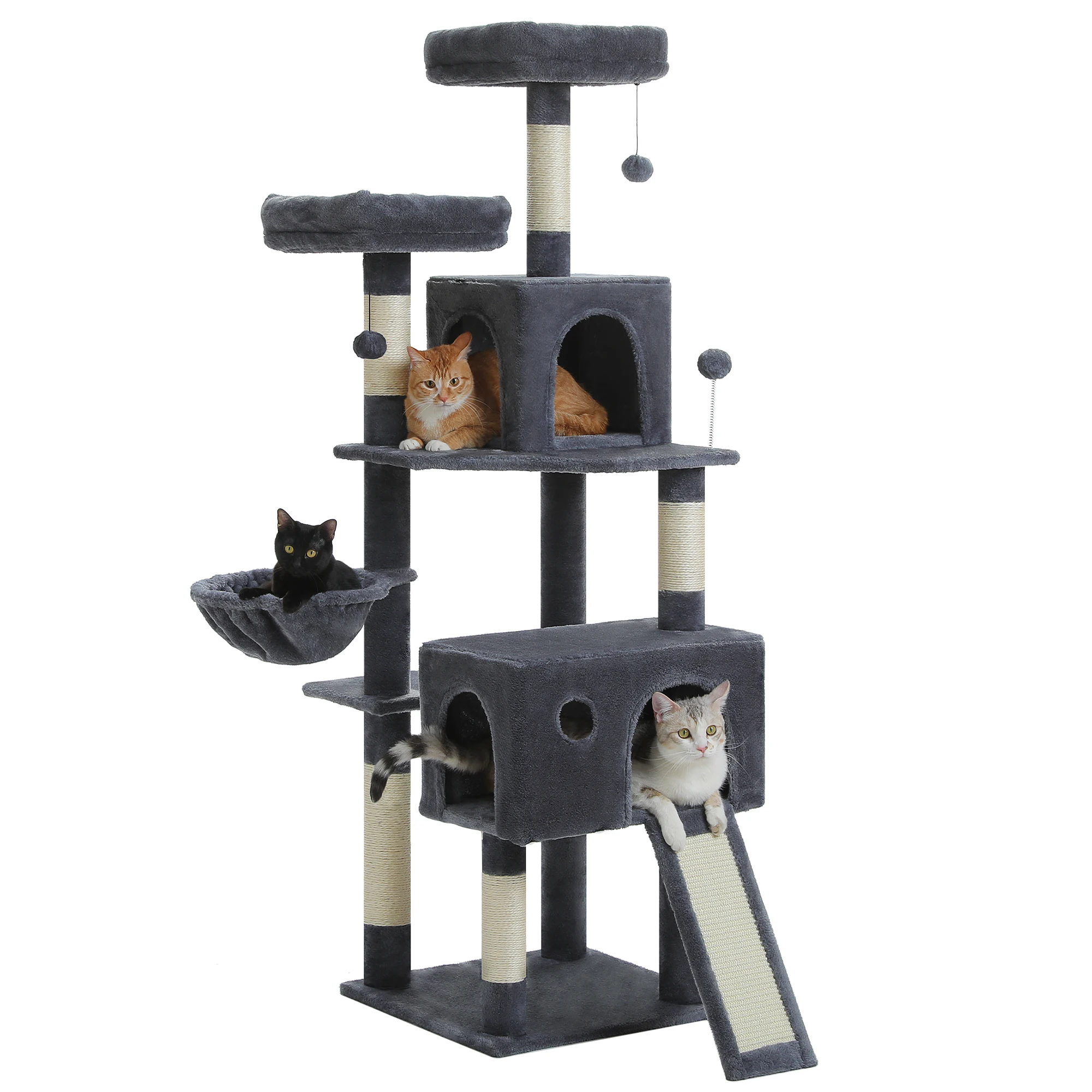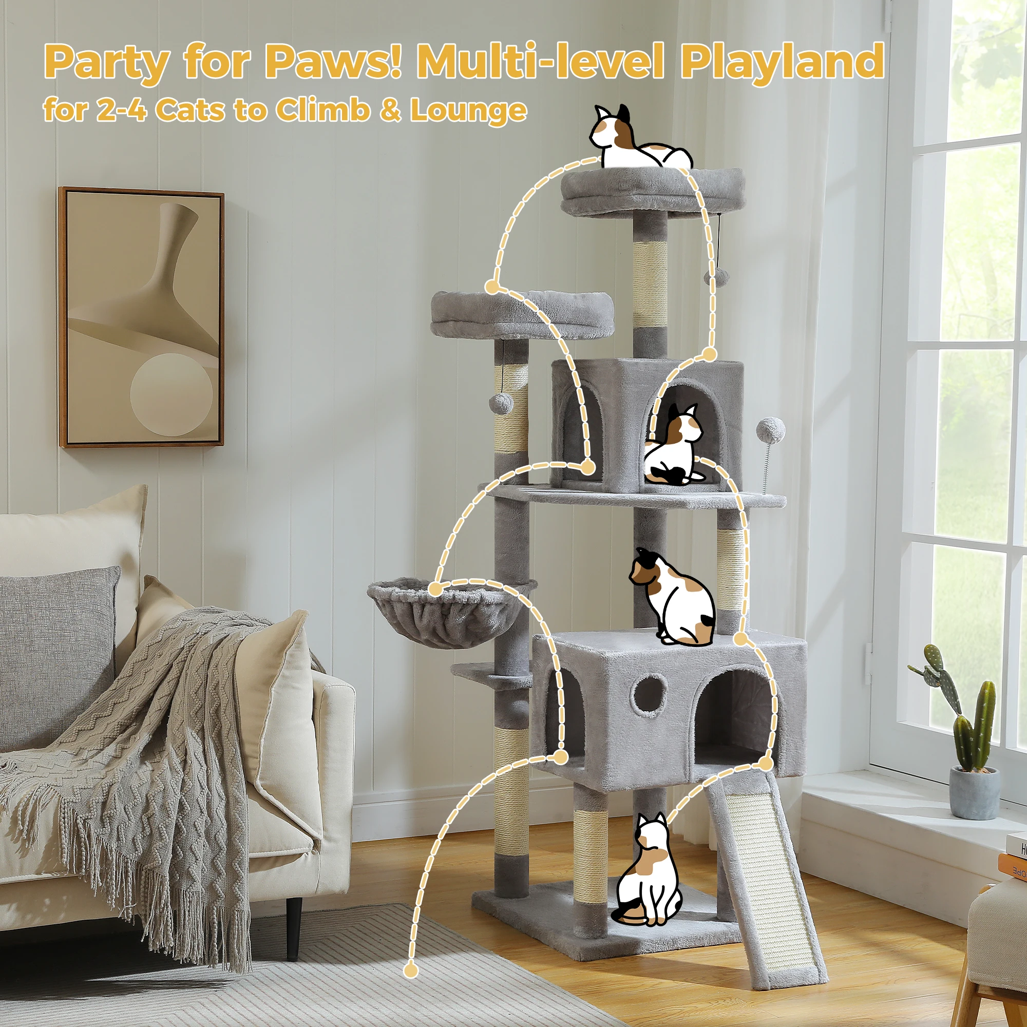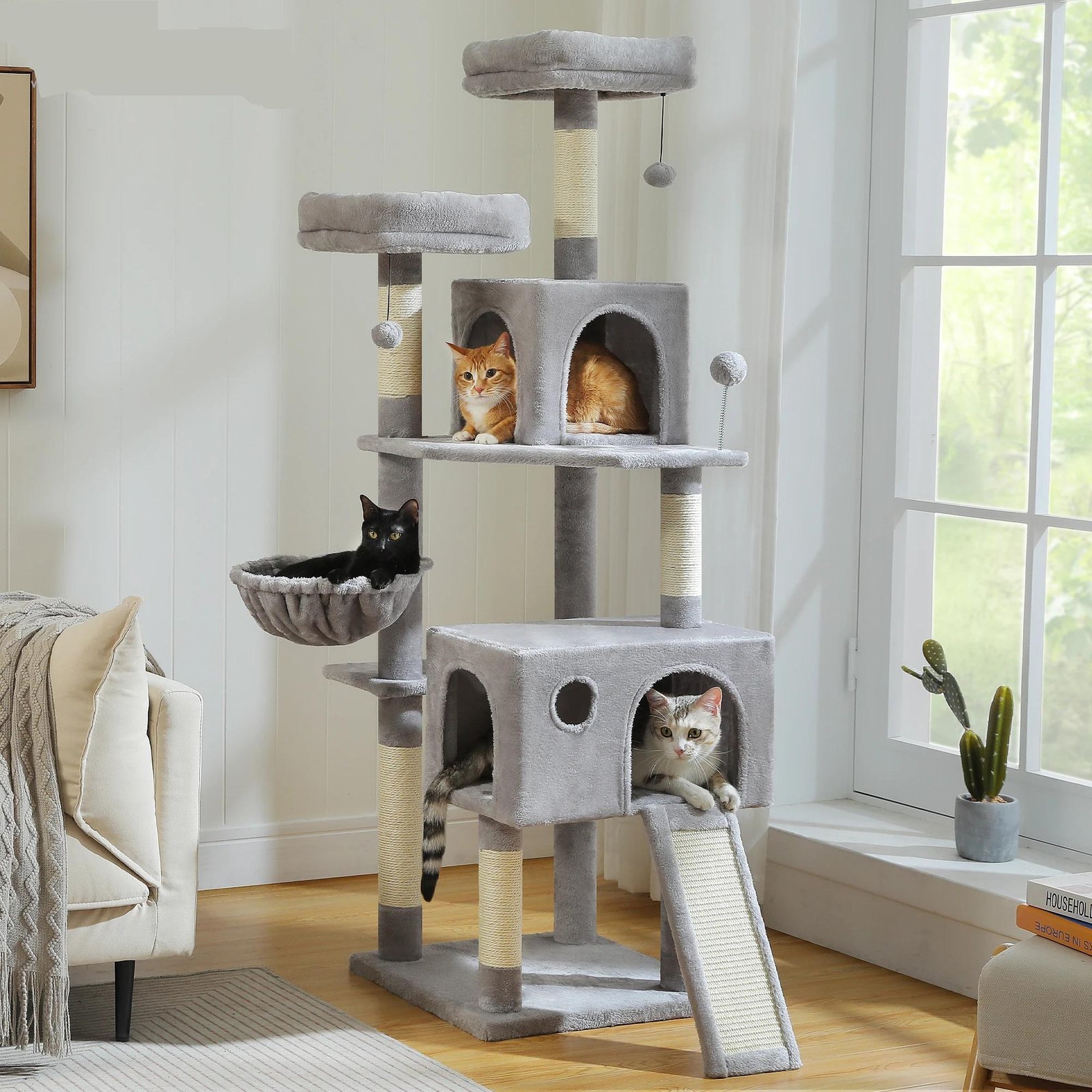 Condo and Perches: The cat tree features a cozy condo at the bottom, offering a private and comfortable space for cats to hide or nap. There are also multiple perches and platforms, some with hammock-like beds, providing various resting spots.