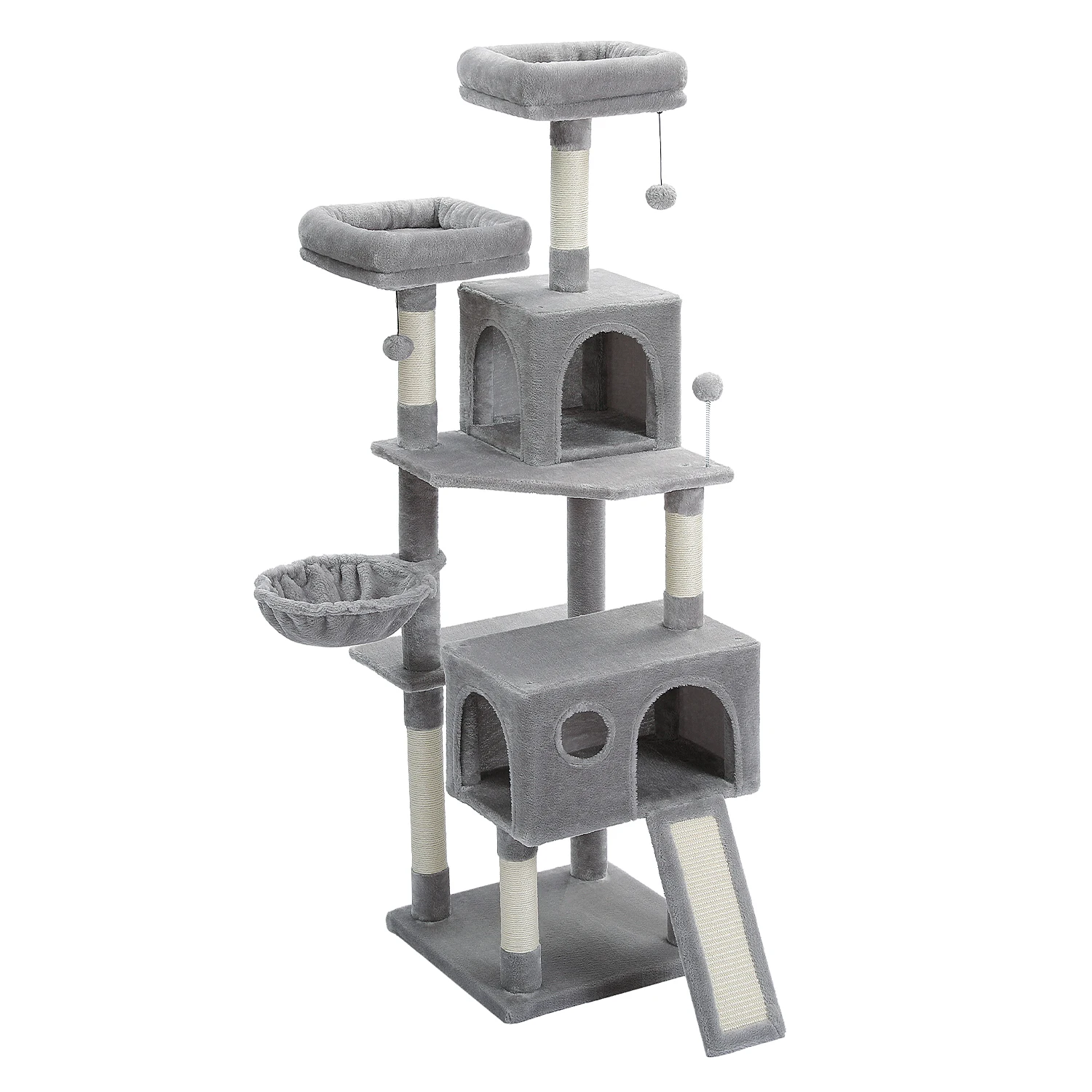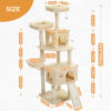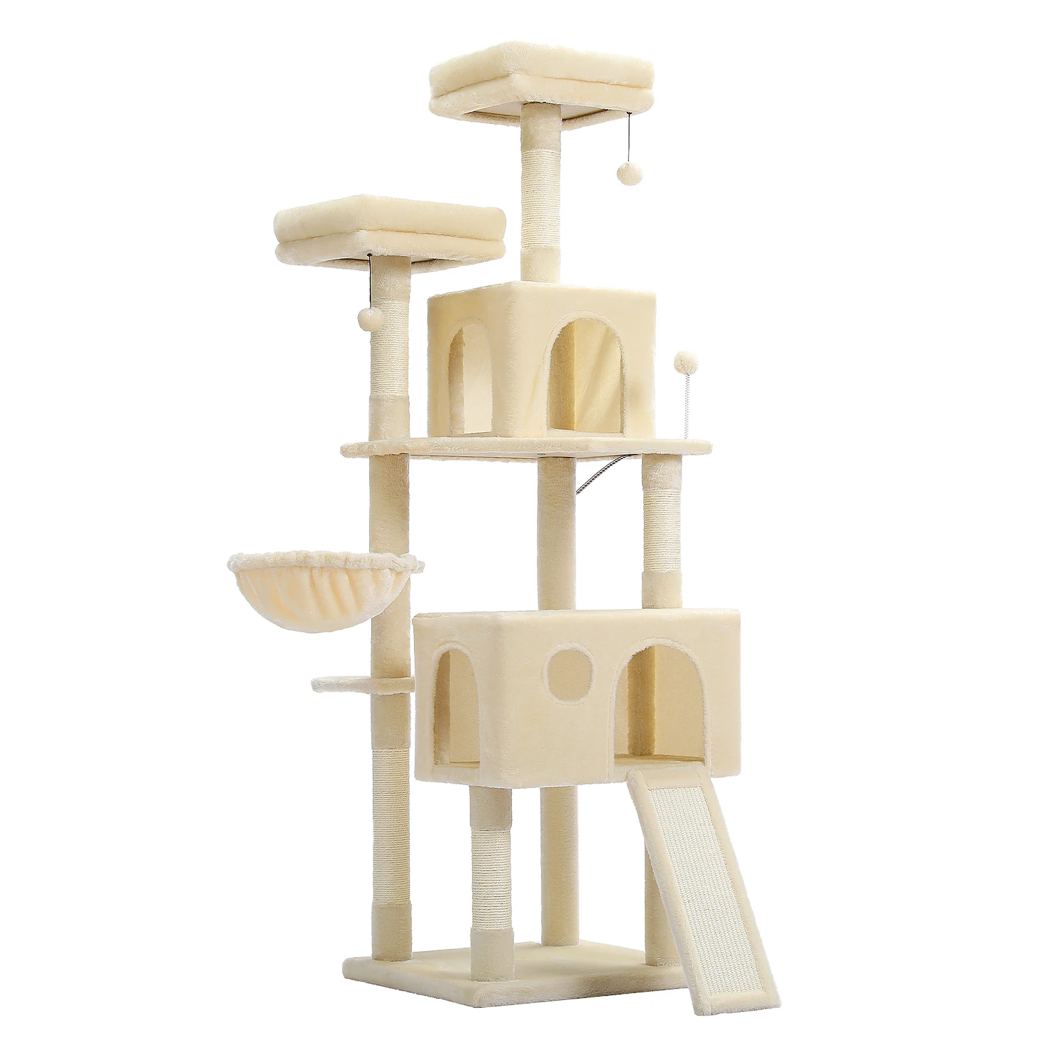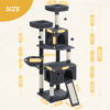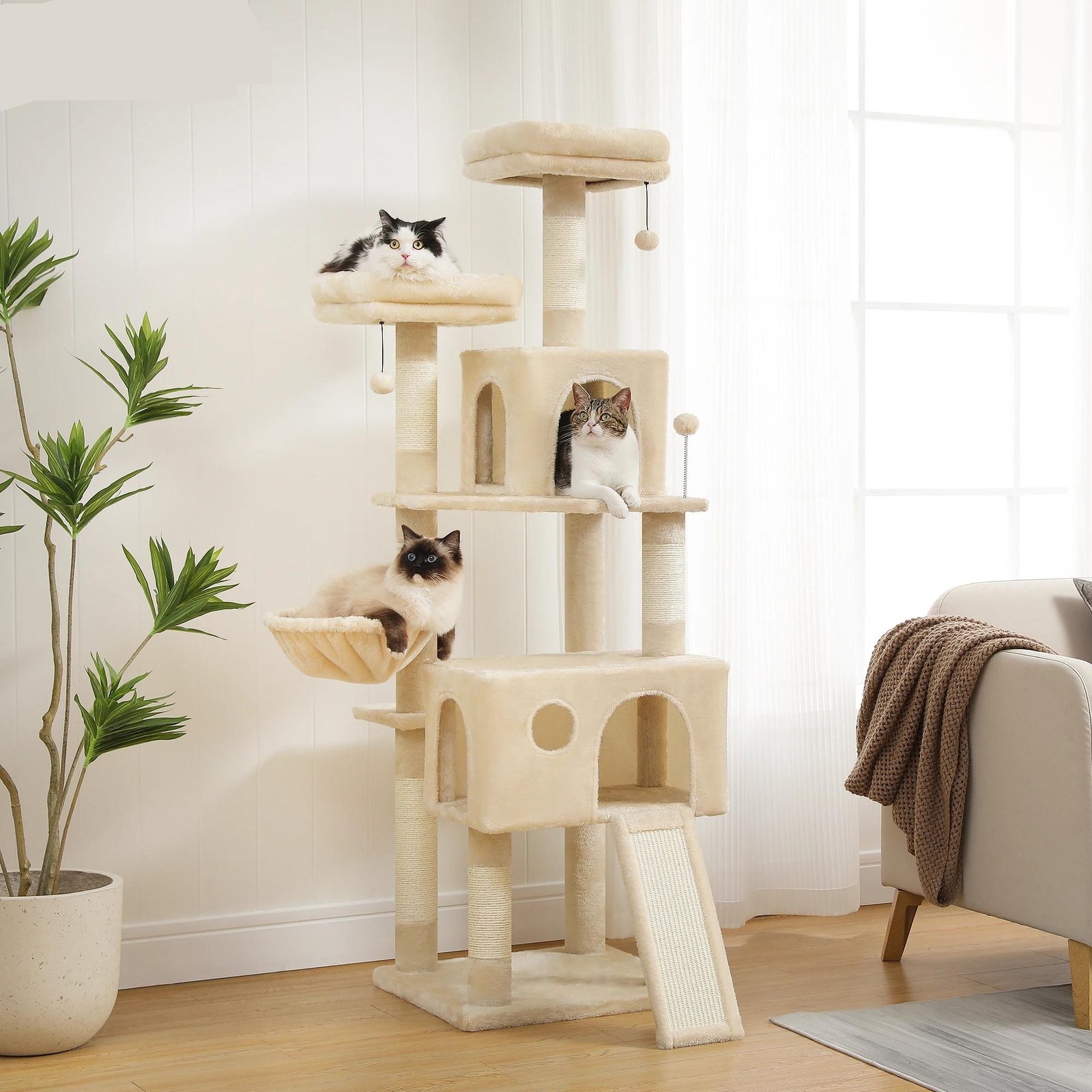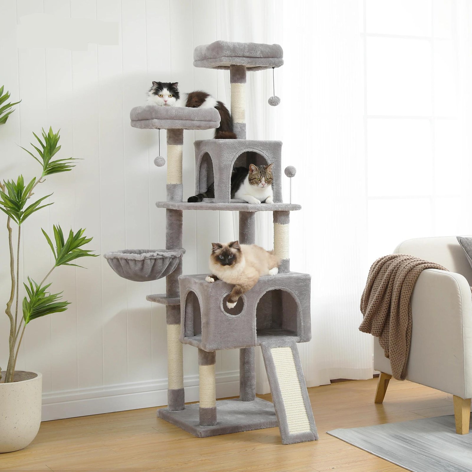 Condo and Perches: The cat tree features a cozy condo at the bottom, offering a private and comfortable space for cats to hide or nap. There are also multiple perches and platforms, some with hammock-like beds, providing various resting spots.