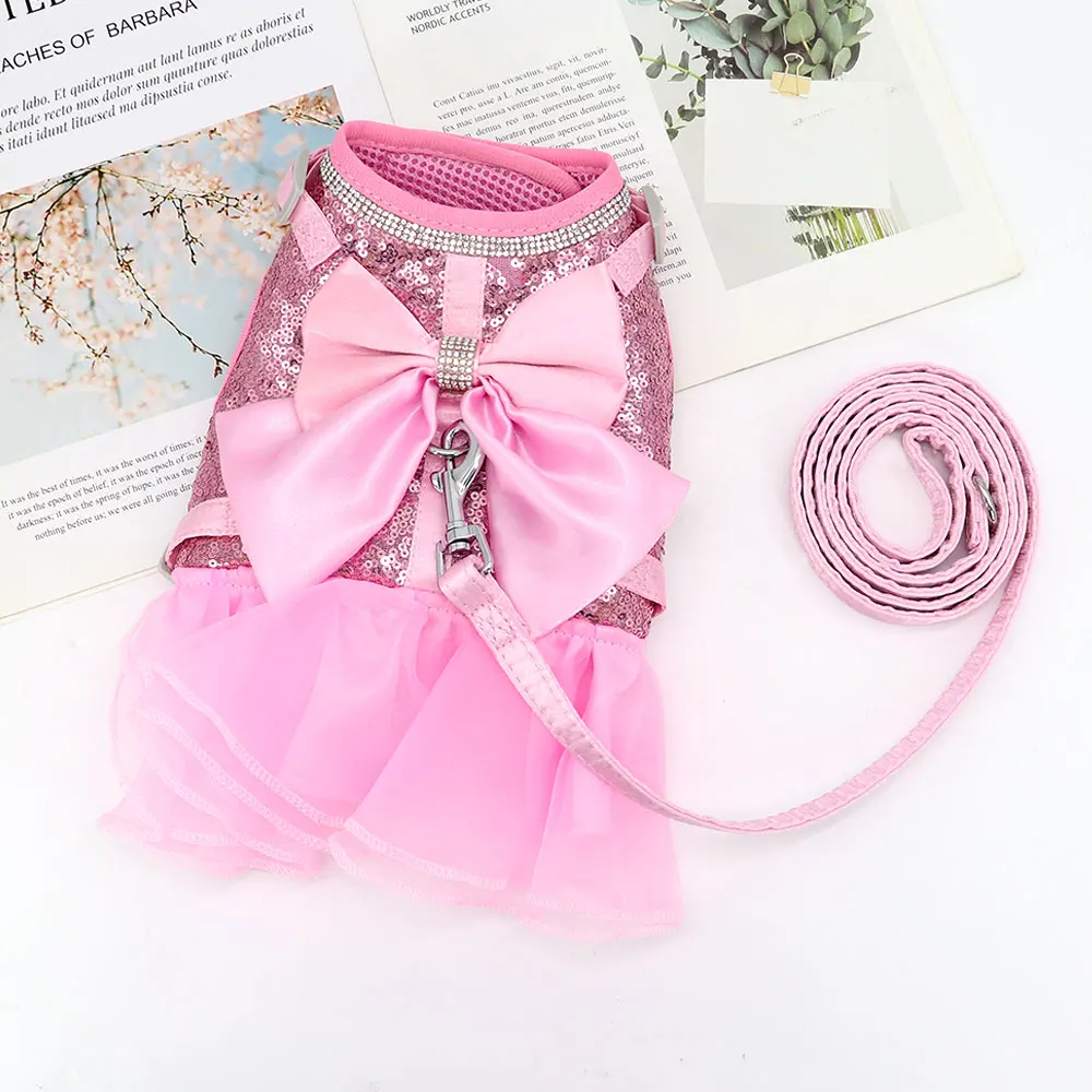 Pink Cat Dress Small Dogs Cats Summer Dresses With Cute Bowknot Bling Rhinestone Accessories Nylon Pet Vest Harness and Leash